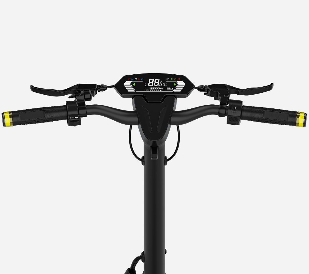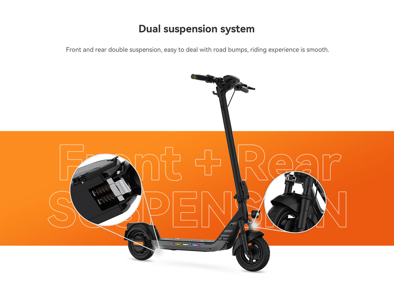Το σύστημα διπλής ανάρτησης προσφέρει πιο ομαλή οδήγηση απορροφώντας τους κραδασμούς από ανώμαλο έδαφος. Πρόσθετα χαρακτηριστικά περιλαμβάνουν φλας για ασφαλή πλοήγηση, μηχανισμό εύκολης αναδίπλωσης για φορητότητα και μεγάλο ταμπλό για καλή ορατότητα στα στατιστικά των διαδρομών.