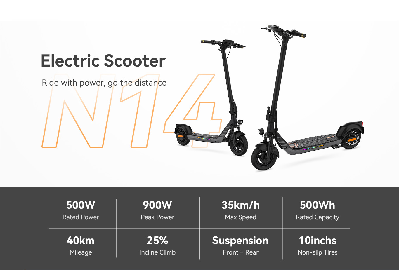 Το N14 συνδέεται με εφαρμογή smartphone, προσφέροντας καλύτερο έλεγχο και δυνατότητες προσαρμογής. Διαθέτει επίσης ισχυρό προβολέα για καλύτερη ορατότητα τη νύχτα και ελαστικά 10 ιντσών για εξαιρετική πρόσφυση και σταθερότητα σε διάφορα εδάφη.
